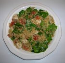 Quinoa, a gluten-free whole grain, helps make this chicken salad tasty as well as healthy. Quinoa is loaded with vitamins and minerals, including iron, magnesium, zinc, B vitamins, Vitamin E and calcium. The sodium content above is based on using low-sodium chicken broth that has 70 mg. of sodium per cup. Low sodium vegetable broth is somewhat higher in sodium, so adjust the sodium content accordingly. 2 servings: 344 mg. sodium per serving 1 cup uncooked quinoa Prep. Instructions 1. Cook and cool quinoa. (See below.) Measure 1 cup of cooked quinoa; freeze the left-overs in 1/2 cup portions for future salads. 2. Combine the 1 cup cooled quinoa, chicken breast, spinach leaves and roasted tomatoes in a large bowl. 3. Combine olive oil, lemon juice, Parmesan cheese and spices in a separate bowl. 4. Have all other ingredients on hand. Cooking Instructions 1. Pour olive oil mixture over the chicken/quinoa mixture. Stir to combine well. Allow to sit for 15 minutes, stirring occasionally. 2. Add walnuts. Stir to combine. Serve. Cooking Quinoa (Note: Many recipes on cooking quinoa call for rinsing the quinoa before placing it into the liquid to cook. This step is to remove the saponins, chemical compounds found in qunoa, that could cause problems for people with irritated or inflamed intestines, or give the quinoa a bitter taste. I have found that the quinoa I use tastes fine without this step, perhaps because the quinoa I purchase has had the saponins removed or been bred with a low saponin content. If you are concerned about the saponins, rinsing the quinoa in a fine mesh sieve or colander helps remove them.) 1. Bring 2 cups low sodium chicken or vegetable broth to a boil. Add 1 cup uncooked quinoa to the pan; stir to combine and eliminate any lumps. 2. Turn heat down to low. Cover and simmer until broth has been absorbed and quinoa is tender, about 15 minutes. Remove from heat. Stir quinoa with a fork. Allow to cool completely. |